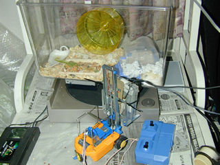 う〜む、実験だからな(^^; 動きが荒っぽいシステムです。 このライブ映像は上記システム説明の画像撮影に利用しているニコンのデジカメCOOLPIX 950をビデオカメラ代わりに使ったのですが、COOLPIX上の液晶モニタでは十分に明るく映っているのにビデオ出力側では暗いままでした。 そのためかなり感度調整で明るい方にシフトしています。 その弊害でかなり悪い画質です。 ライブ用にはやっぱりビデオカメラが必要なようです。 |