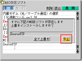同じMOREソフトがある場合 「中止」にタッチ このメッセージが表示される場合、「全て上書き」を選択するとPPP接続設定ファイル(SINPPPIP.INF)まで上書きされてしまいます。("SINPPPIP.INF"はFTPクライアントのために必要なファイルでプロバイダのアクセスポイントやコネクションID、パスワード、DNSアドレスなどを記述したファイルです) |